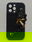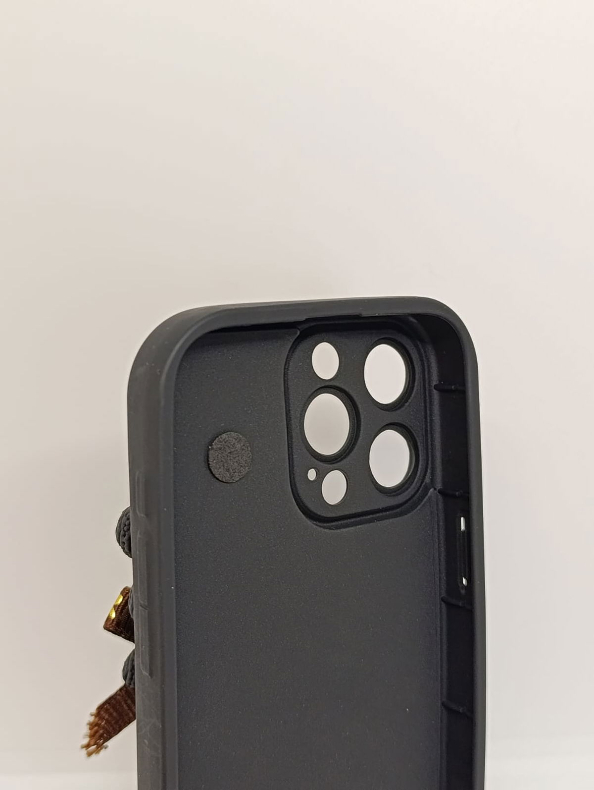 La parte trasera presenta una elegante textura negra con un sutil efecto glitter , ofreciendo un agarre seguro y un look sofisticado.
