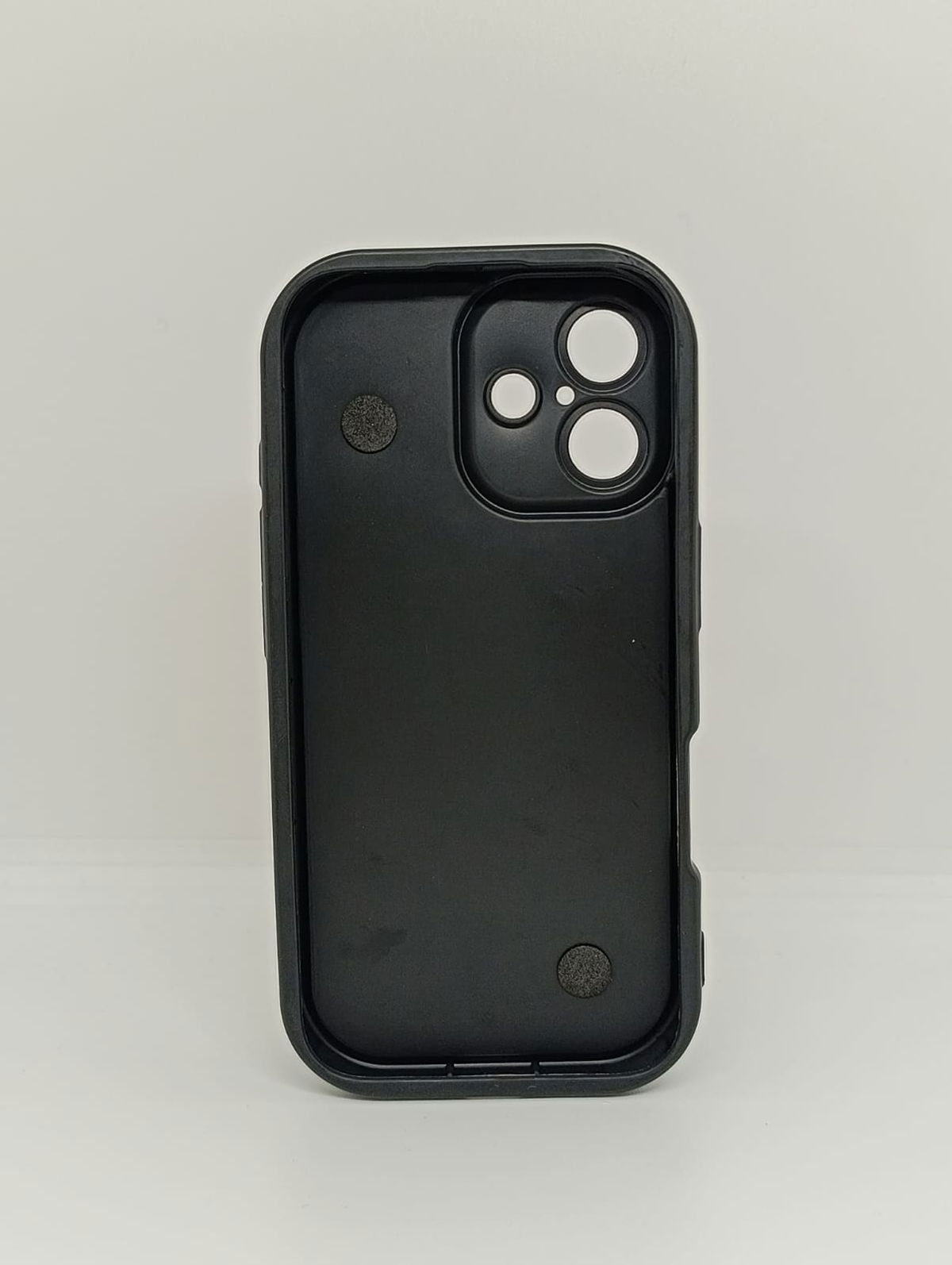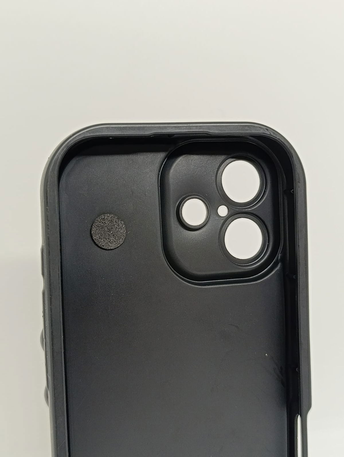 La parte trasera presenta una elegante textura negra con un sutil efecto glitter , ofreciendo un agarre seguro y un look sofisticado.