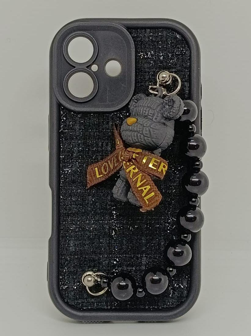 Incluye un osito de peluche 3D en color negro con textura tejida y un pequeño corazón naranja en la nariz.