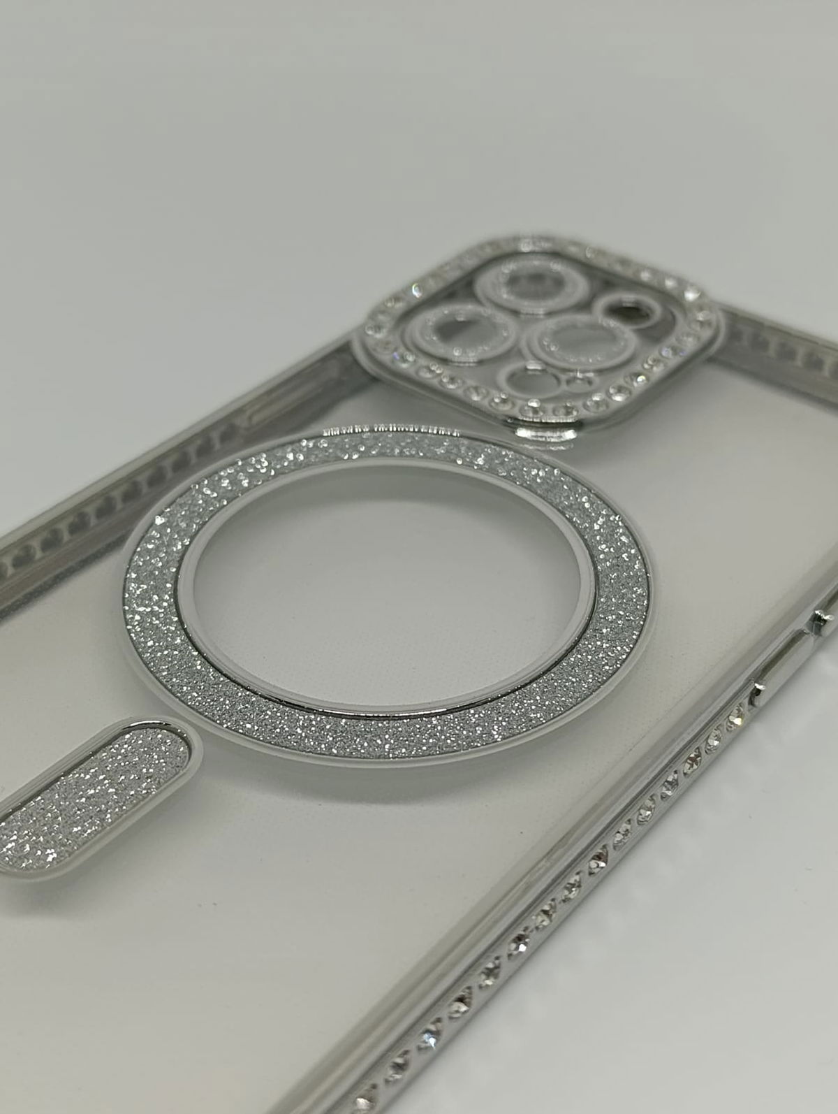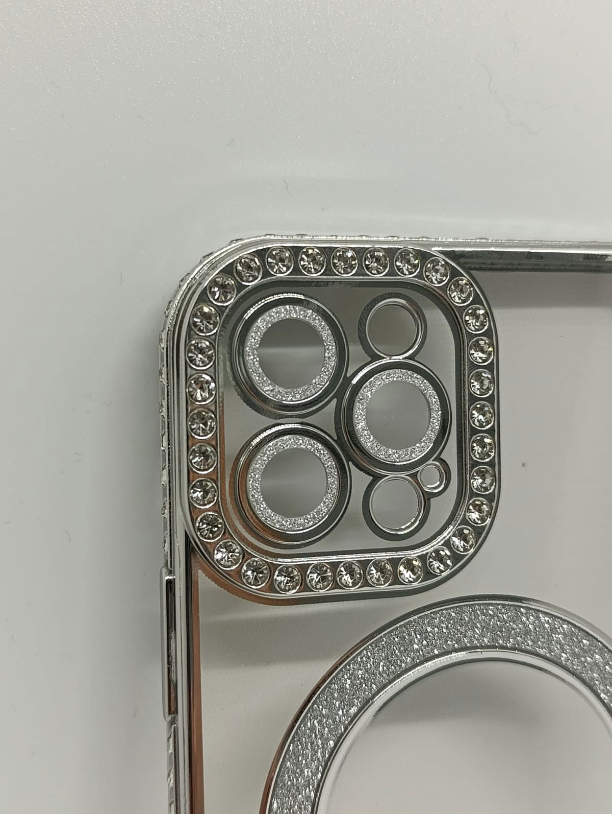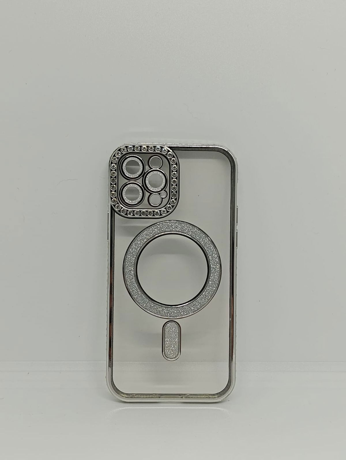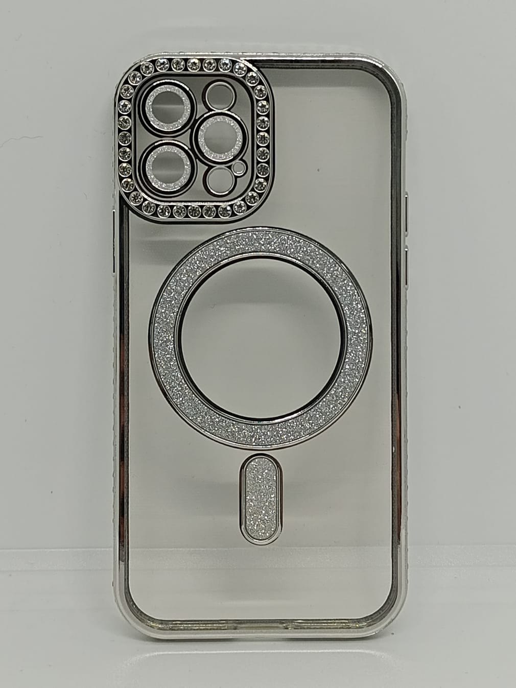 Este protector combina una estética de alta gama con tecnología de carga inalámbrica eficiente. Su acabado plateado y detalles en pedrería lo convierten en la opción ideal para usuarios que buscan un estilo sofisticado.