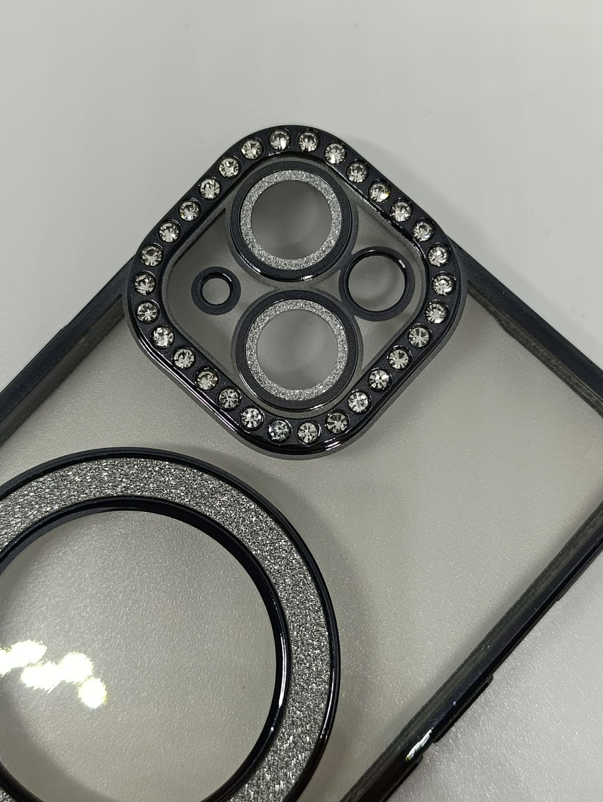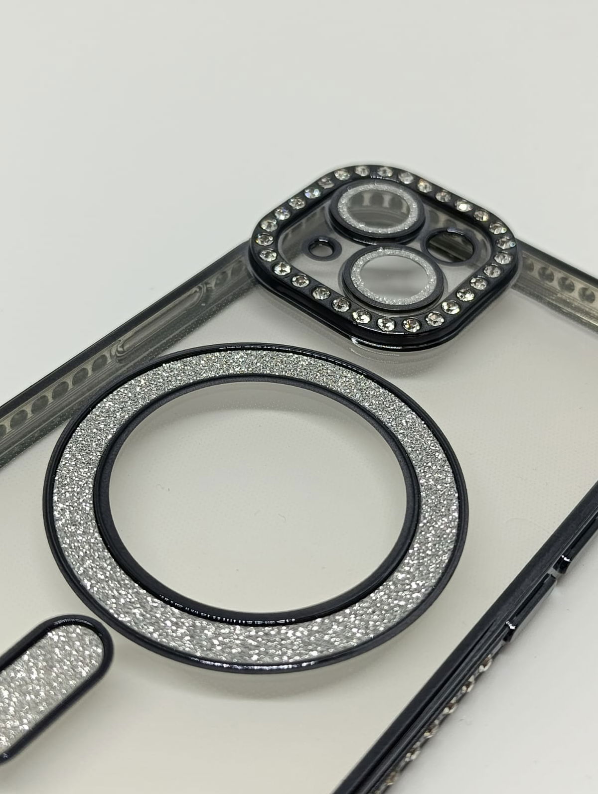Este protector combina una estética de alta gama con tecnología de carga inalámbrica eficiente. Su acabado negro y detalles en pedrería lo convierten en la opción ideal para usuarios que buscan un estilo sofisticado.