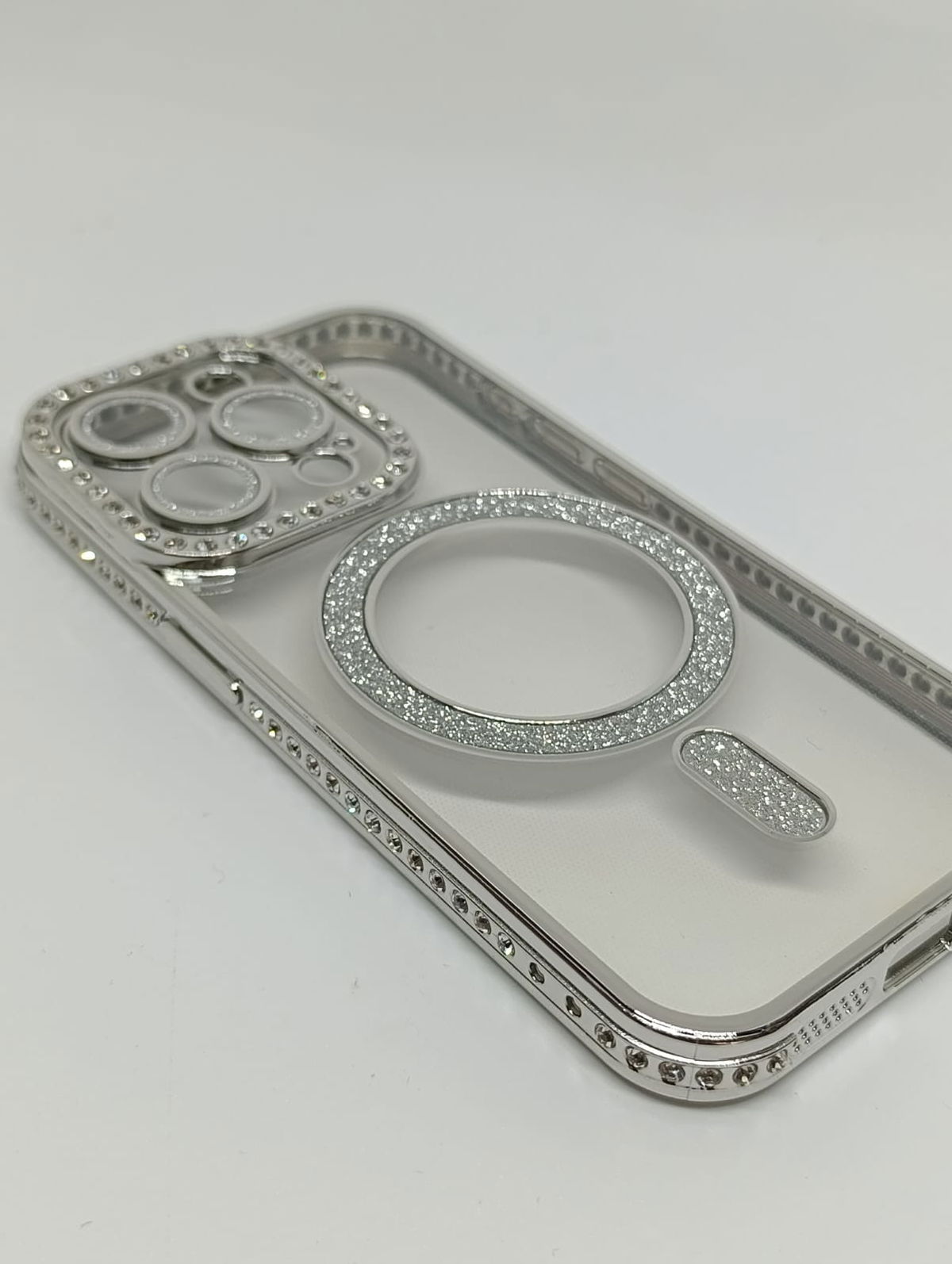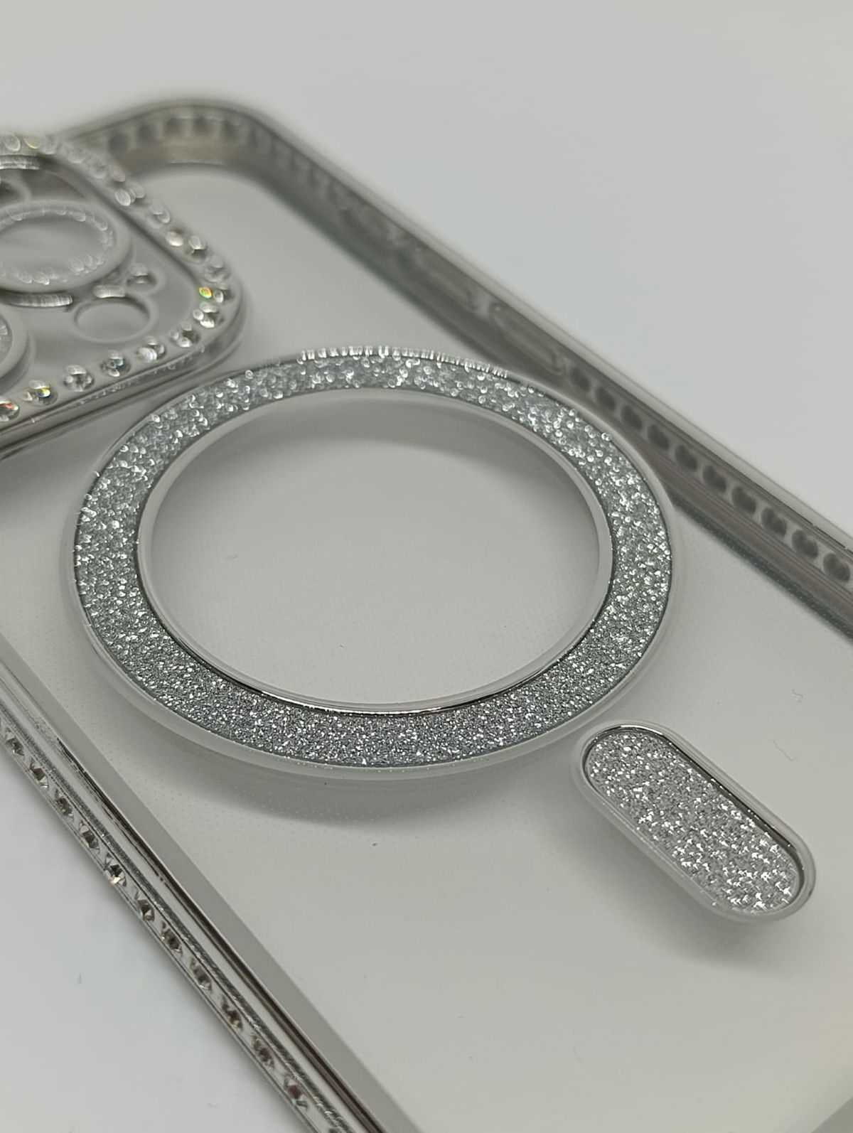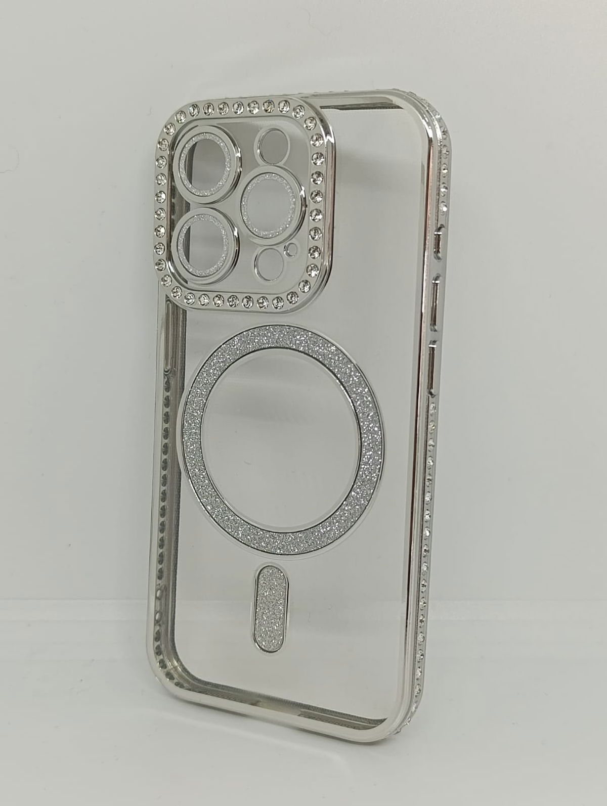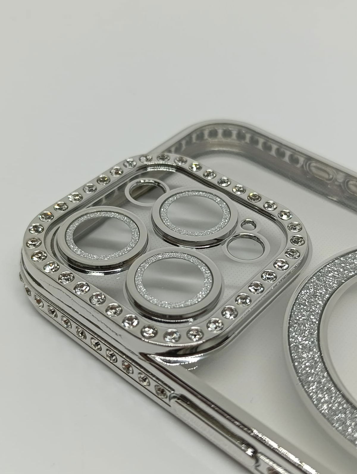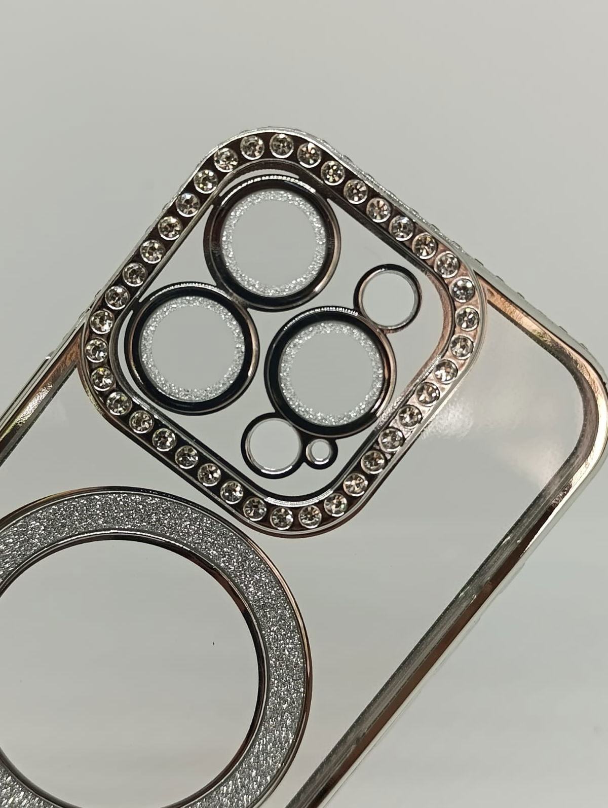 Este protector combina una estética de alta gama con tecnología de carga inalámbrica eficiente. Su acabado plateado y detalles en pedrería lo convierten en la opción ideal para usuarios que buscan un estilo sofisticado.