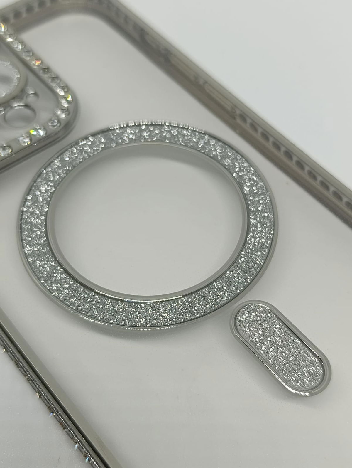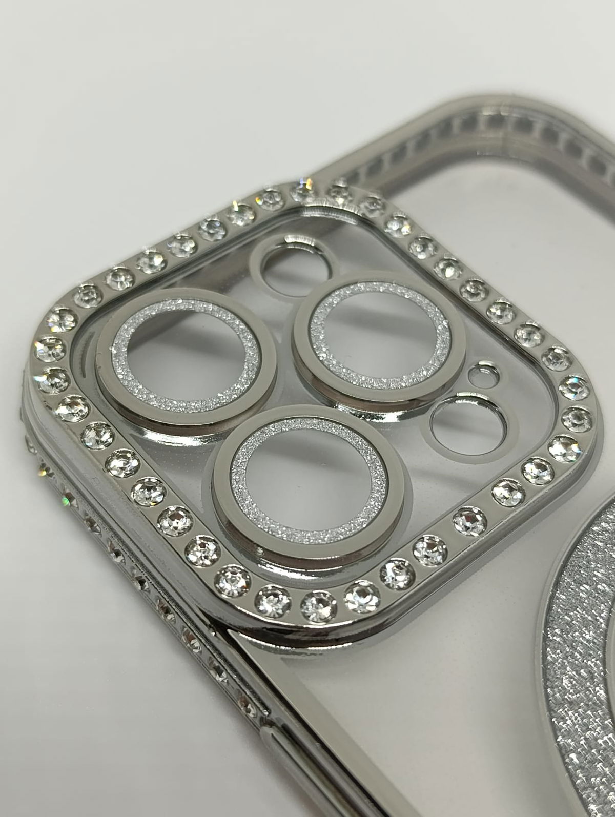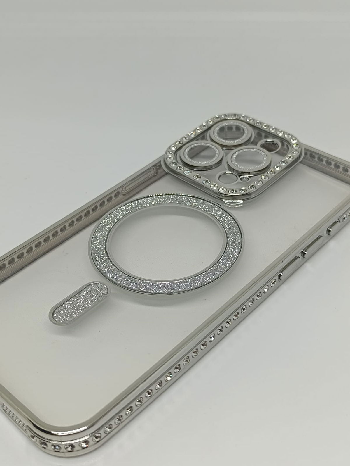 Este protector combina una estética de alta gama con tecnología de carga inalámbrica eficiente. Su acabado plateado y detalles en pedrería lo convierten en la opción ideal para usuarios que buscan un estilo sofisticado.
